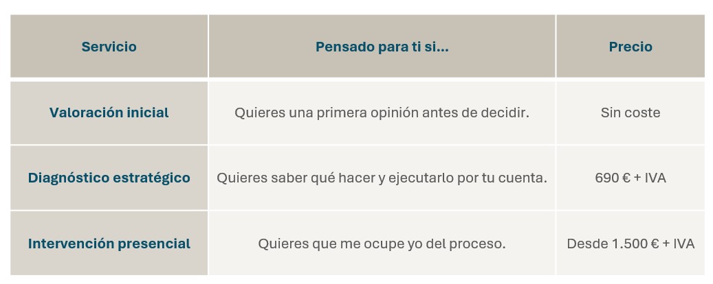 Si tras esta primera valoración ves que quieres una propuesta completa para hacerlo por tu cuenta, el siguiente paso sería el Diagnóstico estratégico. Si prefieres que me ocupe yo de la compra, la preparación y la ejecución, la opción adecuada sería la Intervención estratégica presencial.